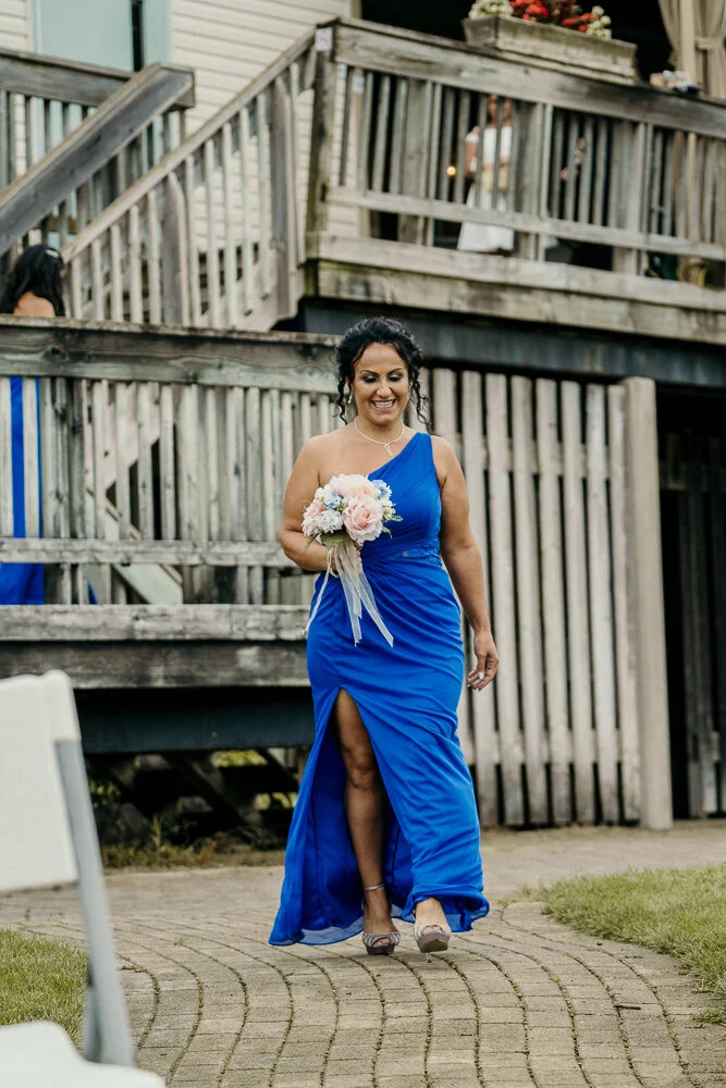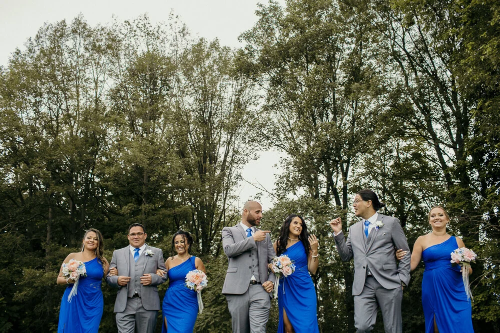 They also had to rearrange their timeline for the same reason which meant some of the wedding traditions wouldn’t work out for them. Restrictions set onto the venue at Pine Knot Golf and Country Club in Dorchester, Ontario meant that they had to be out of the building way earlier than originally planned. So, they came to me and asked for some ideas. I suggested that they go with a newer tradition that is becoming very popular now, and that is to do a First Look. This would shift the whole days timeline so that we would have Bride/Groom First look photos, (we also added Mom & Dad with Bride First Look) we were also able to have Family formal photos done and then tour the course for Bridal Party and more Bride/Groom portraits. All this would be completed before the ceremony. The guests didn’t have to wait in between the ceremony and the reception for the bridal party to come back from their photo session either. It was seamless for them.